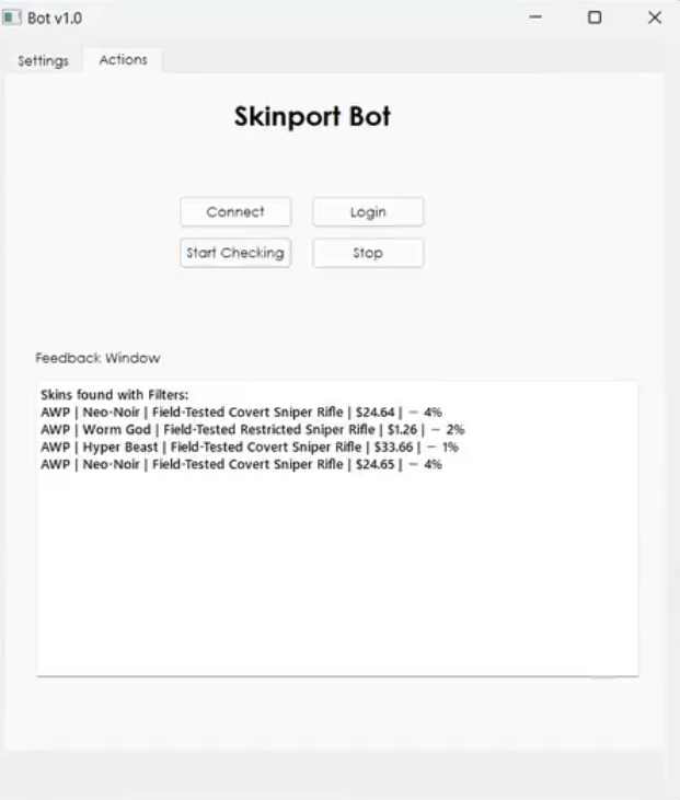 Bot je navržen tak, aby automaticky monitoroval trh a obchody, kde jsou dostupné skiny pro CS2. S využitím technik učení AI a analýzy dat, bot identifikuje výhodné příležitosti a provádí nákupy skinů za optimální ceny.